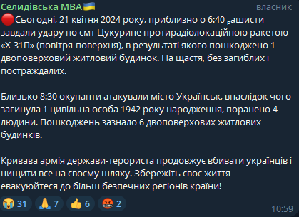 "Около 8:30 оккупанты атаковали город Украинск, в результате чего погиб 1 гражданский 1942 года рождения, ранены 4 человека. Повреждения получили 6 двухэтажных жилых домов" - говорится в сообщении.