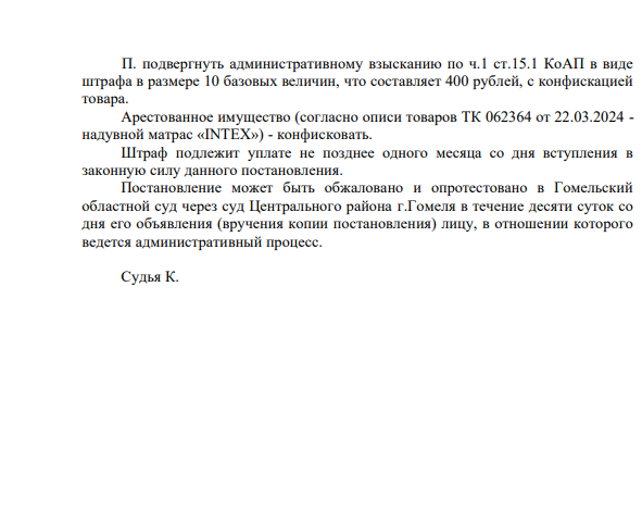 Согласно решению суда, украинец должен уплатить штраф в 400 белорусских рублей (около 5 тысяч грн), а матрас фирмы "Интекс", стоимость которого оценили в 25 рублей (около 300 грн), подлежит конфискации. О дальнейшей судьбе гражданина Украины ничего не сообщается.