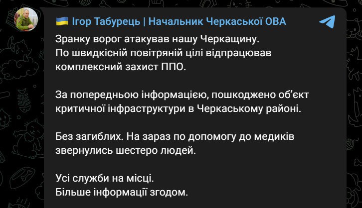 08.10 В районе Черкасс поврежден объект критической инфраструктуры, сообщил начальник ОВА Табурец.