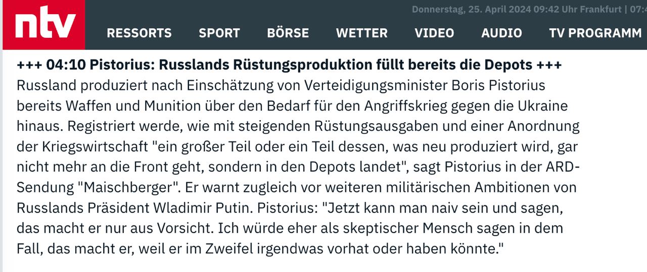 09.52 Россия заполняет склады оружием и боеприпасами, производя его больше, чем используя в Украине, заявил министр обороны Германии Писториус, передает N-TV.