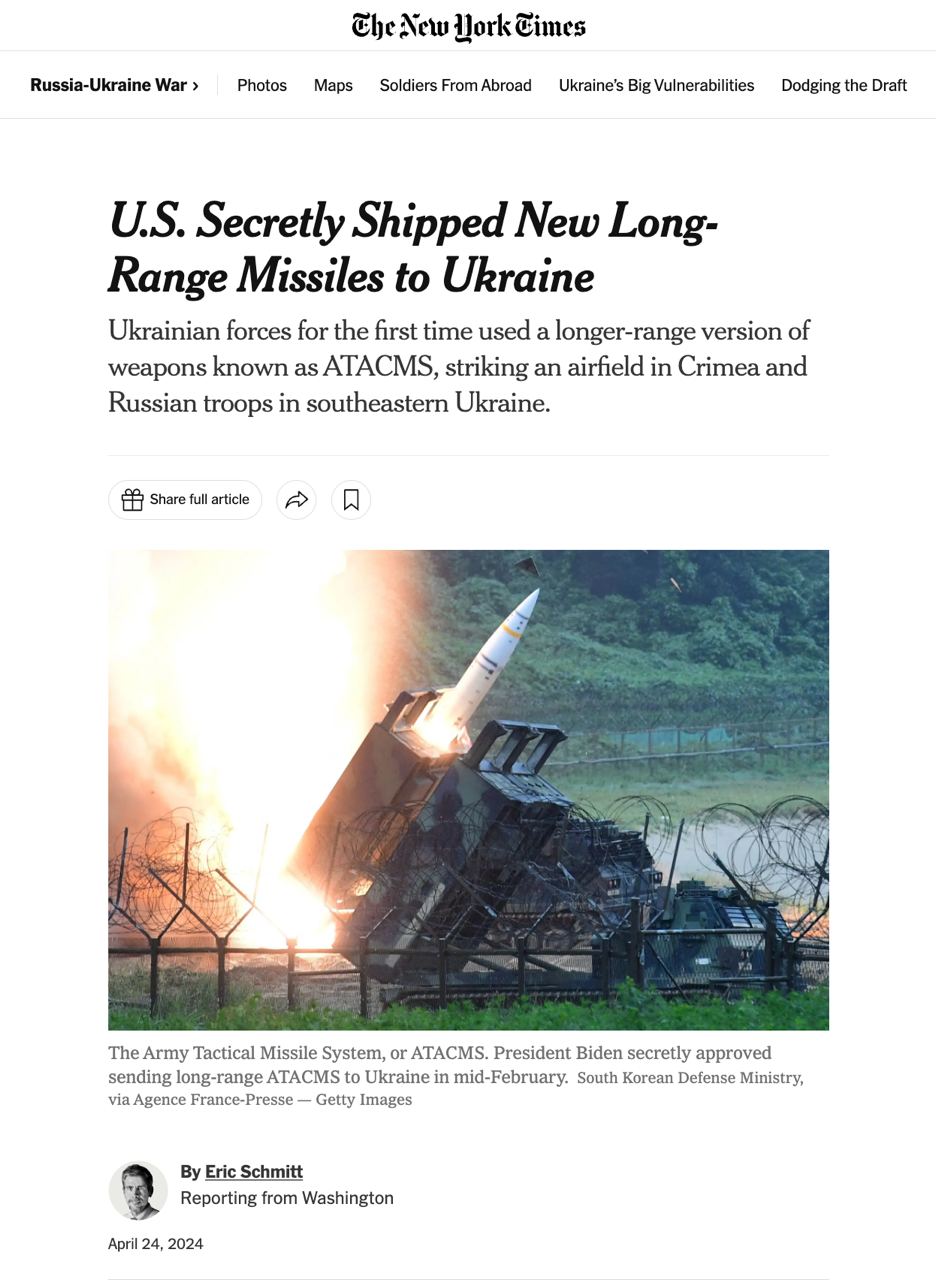12.25 Украина уже тайно получила более 100 дальнобойных ракет ATACMS и использовала их против РФ, сообщает The New York Times со ссылкой на источники.