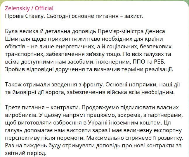 "Сегодня основной вопрос – защита. Был обширный и детальный доклад премьер-министра Дениса Шмыгаля о прикрытии жизненно необходимых для страны объектов – не только энергетических, но и социальных, безопасных, транспортных, обеспечения связи и т.п... Дал соответствующие поручения и определил сроки реализации", – написал он.