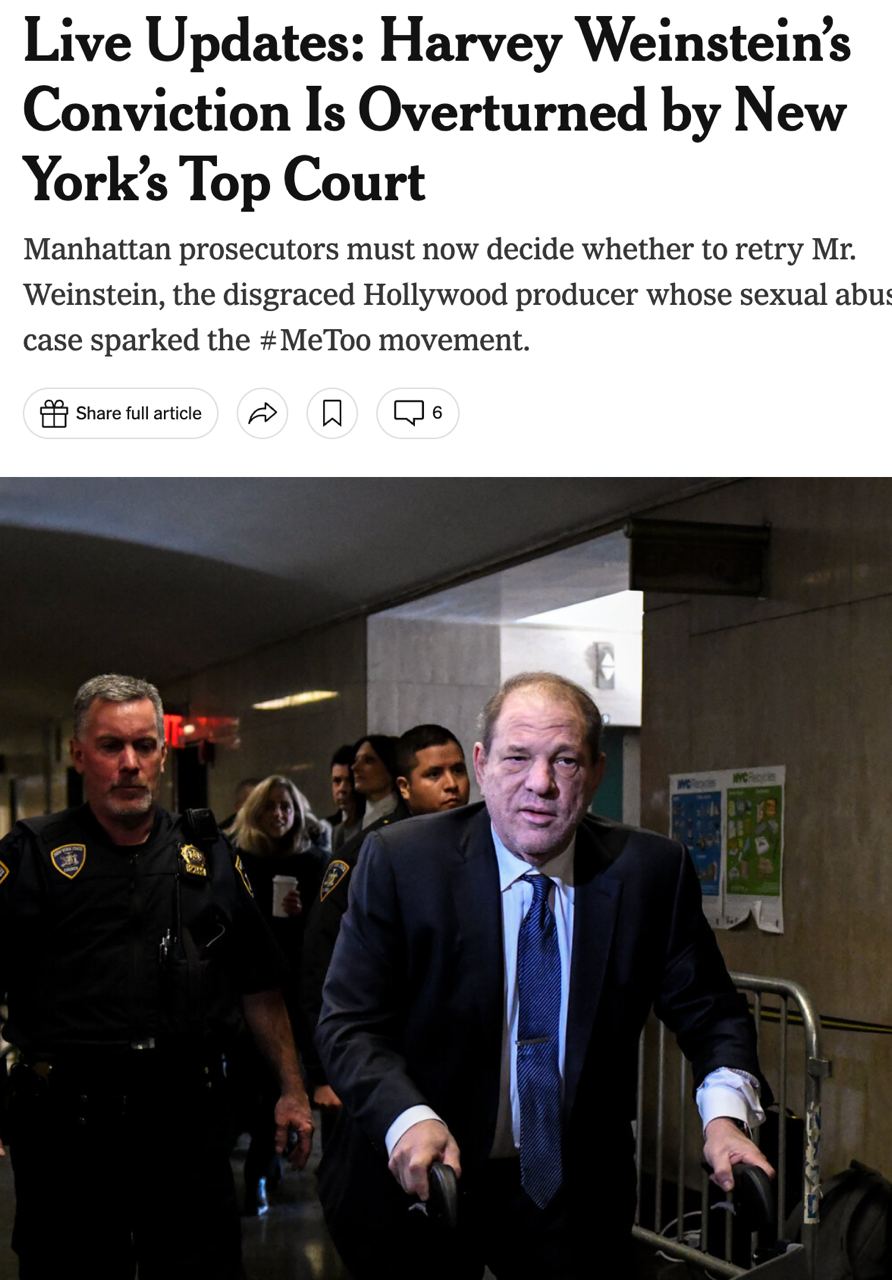 Высший суд штата Нью-Йорк отменил приговор американскому кинопродюсеру Харви Вайнштейну, которого по многочисленным обвинениям актрис в изнасилованиях и домогательствах осудили на 23 года тюрьмы.