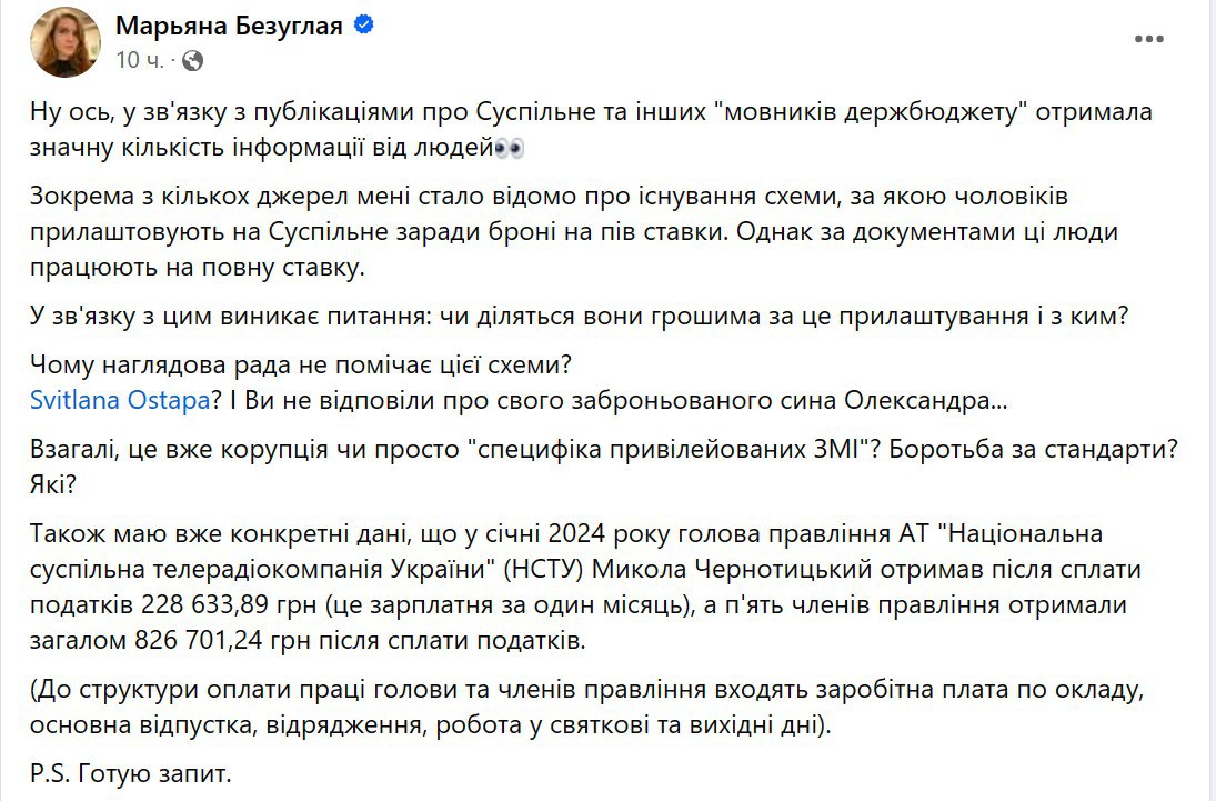 "Из нескольких источников мне стало известно о существовании схемы, по которой мужчин пристраивают на "Суспильное" ради брони на полставки. Однако по документам эти люди работают на полную ставку. В связи с этим возникает вопрос: делятся ли они деньгами за это пристраивание и с кем? Почему наблюдательный совет не замечает эту схему?", - написала Безуглая.