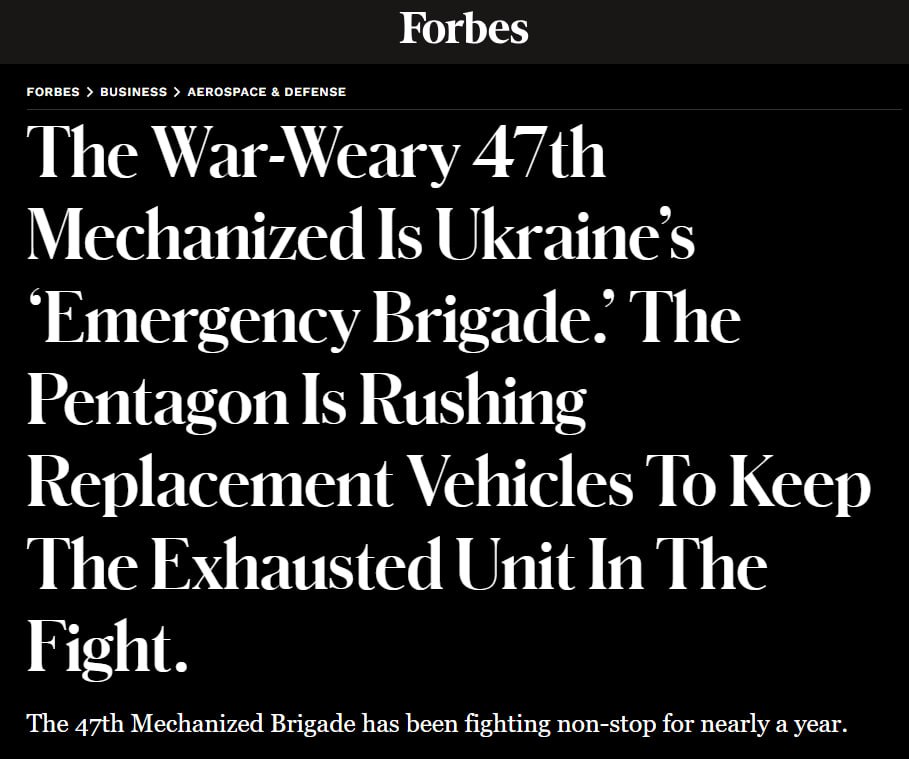 Издание напоминает, что 47-я бригада возглавляла контрнаступление ВСУ у Работино еще в июне и понесла большие потери на российских минных полях. 4 месяца спустя бригада была брошена за 100 миль в бойню в Авдеевке. Город пал в феврале, и 47-я осталась прикрывать отступление, а затем двинулась поддержать фланг в Очеретино.