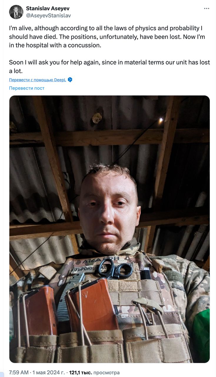 16:05 Украинский журналист и писатель Станислав Асеев получил контузию на фронте, о чем сообщил в Х.