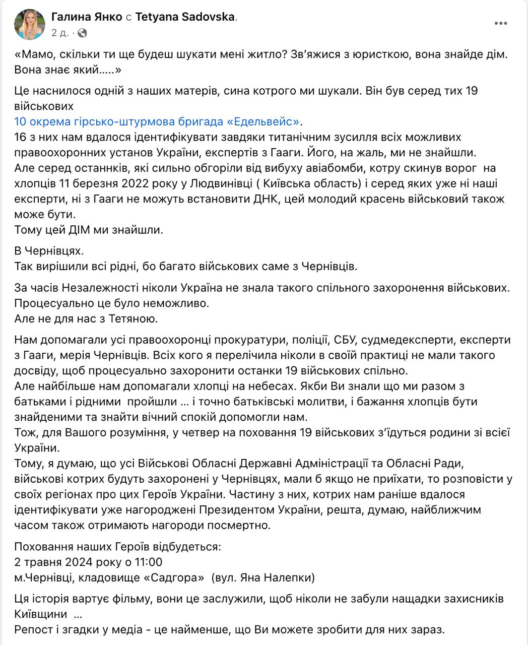 В Черновцах захоронили 16 военных, погибших в результате авианалета 11 марта 2022 года на Людвиновку Киевской области, сообщила адвокат семей погибших Галина Янко.