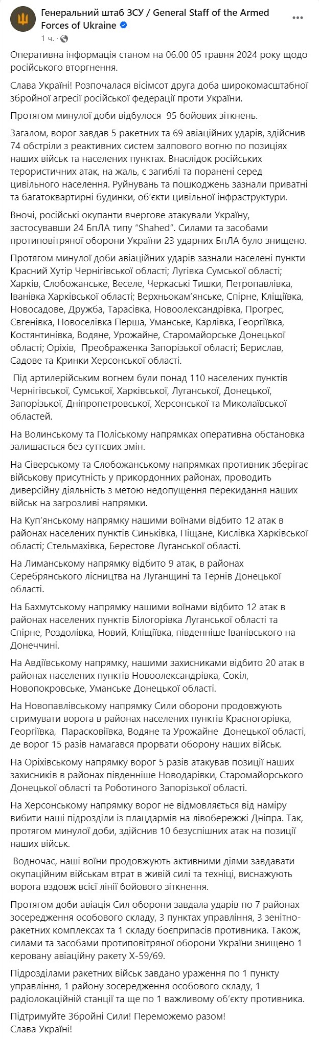 За прошедшие сутки произошло 95 боевых столкновений. Всего россияне нанесли 5 ракетных и 69 авиационных ударов, совершили 74 обстрела из РСЗО по позициям наших войск и населенным пунктам.