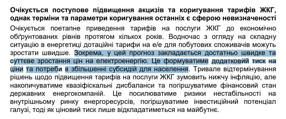 "В этот прогноз закладывается достаточно быстрый и существенный рост цен на электроэнергию. Это будет формировать дополнительное давление на цены и потребности в увеличении субсидий для населения", – говорится в документе.