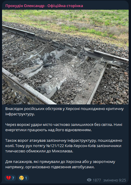 "В настоящее время движение поезда №121/122 Киев — Херсон — Киев железнодорожники временно ограничили Николаев. Оттуда пассажиров в Херсон и везти автобусами. В настоящее время все 99 пассажиров находятся в безопасности" - говорится в сообщении.