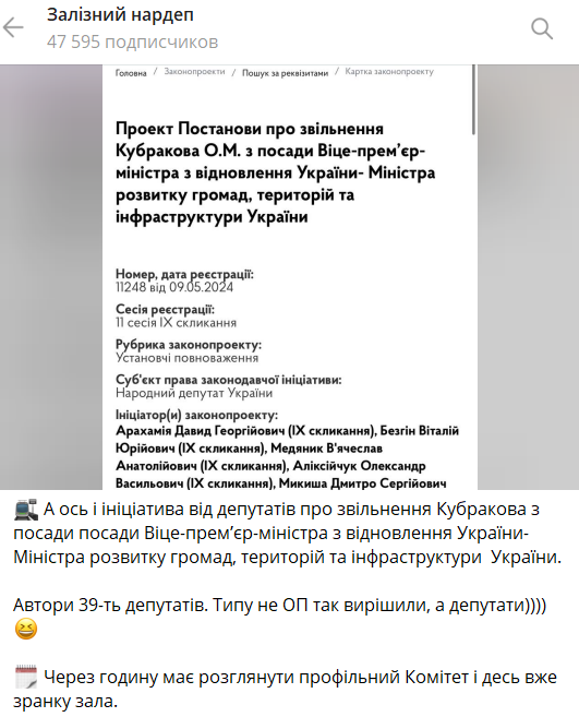 При этом следует напомнить, что Кубраков занимал два поста - вице-премьера и министра инфраструктуры. Соответствующее постановление уже внесено в Раду, сообщает народный депутат Алексей Гончаренко.