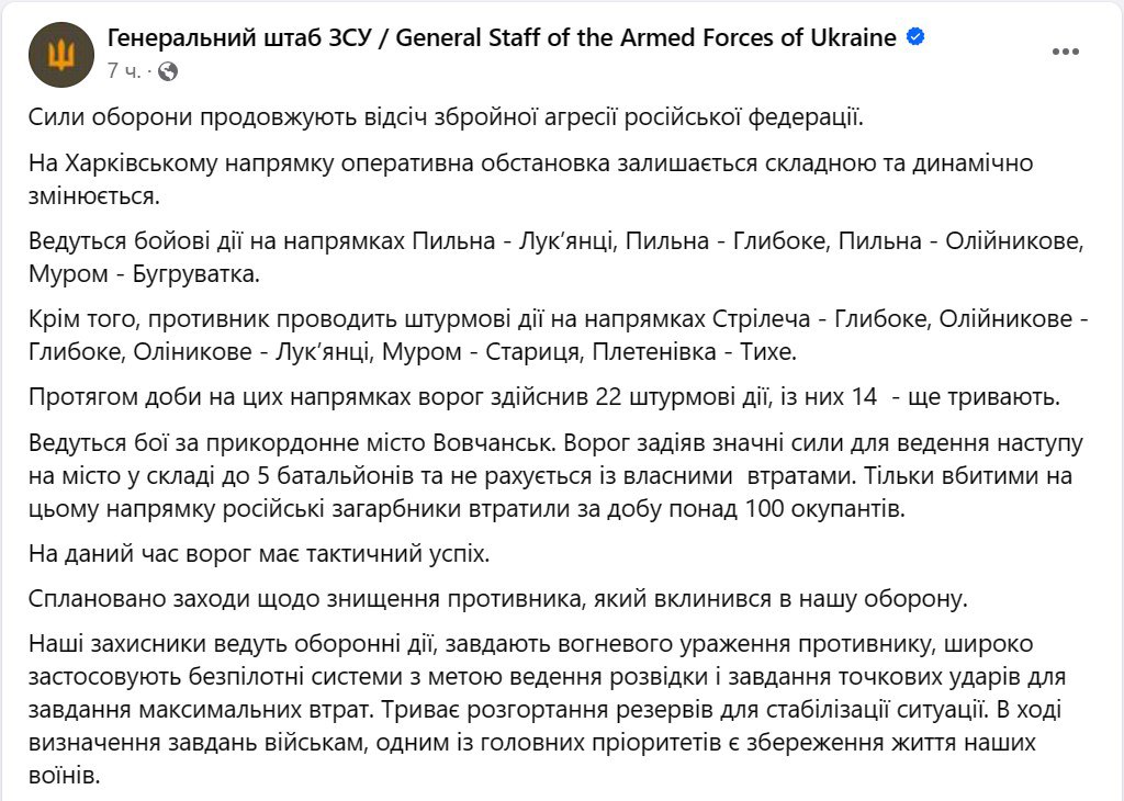 Ранее Генштаб ВСУ также сообщил, что начались бои в районе населённого пункта Старица (западнее Волчанска).