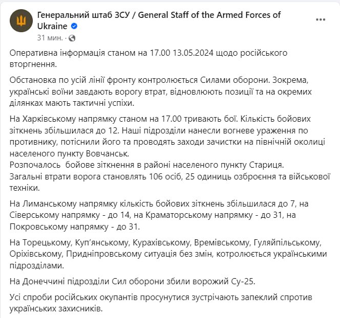 "Наши подразделения… проводят мероприятия по зачистке на северной окраине населенного пункта Волчанск", — говорится в сводке Генштаба.