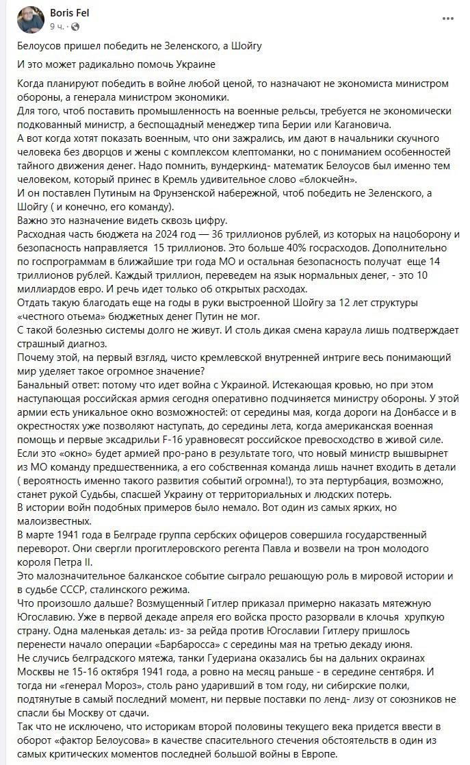"Белоусов пришел победить не Зеленского, а Шойгу. Истекающая кровью, но при этом наступающая российская армия сегодня оперативно подчиняется министру обороны. У этой армии есть уникальное окно возможностей: от середины мая, когда дороги на Донбассе и в окрестностях уже позволяют наступать, до середины лета, когда американская военная помощь и первые эксадрильи F-16 уравновесят российское превосходство в живой силе.