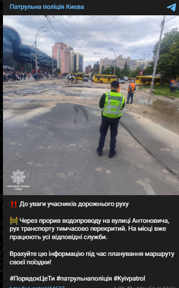Полиция Киева заявила, что из-за прорыва водопровода на улице Антоновича, движение транспорта временно перекрыто. На месте уже работают все соответствующие службы.