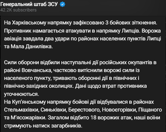 "Силы обороны отбили наступательные действия российских оккупантов в районе Волчанска, частично вытеснили вражеские силы из населенного пункта, продолжаются оборонительные действия в северных и северо-западных окрестностях. Данные о потерях противника уточняются", - говорится в сообщении Генштаба.