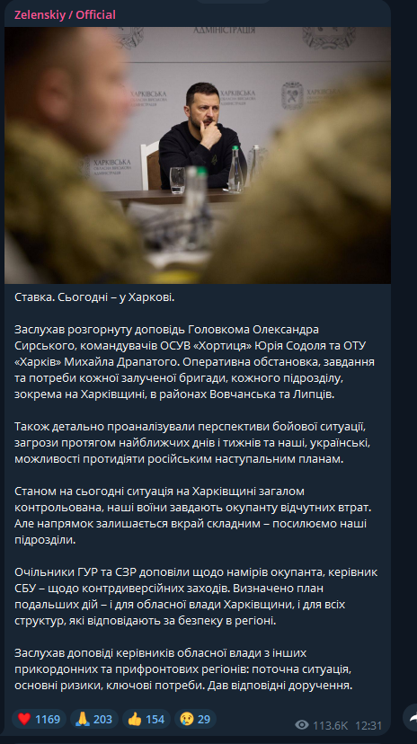 Зеленский провел сегодняшнюю Ставку в Харькове. Фото: телеграм президента