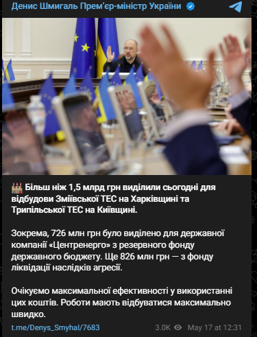 "Более 1,5 млрд гривен выделили сегодня для восстановления Змиевской ТЭС в Харьковской области и Трипольской ТЭС в Киевской области", - говорится в сообщении.