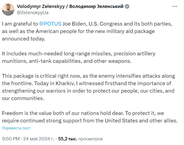 Президент Украины Владимир Зеленский сообщил, что сегодняшний пакет военной помощи от США "включает в себя столь необходимые ракеты большой дальности".