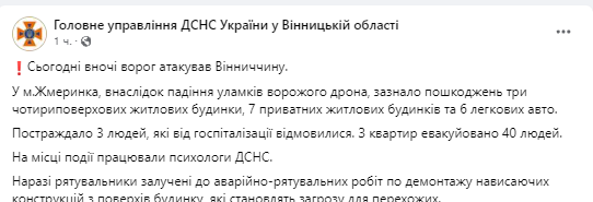 Сегодня ночью российские войска атаковали ударными дронами Винницкую область. В результате падения обломков "Шахеда" в Жмеринке повреждены жилые дома и автомобили. Пострадали три человека.