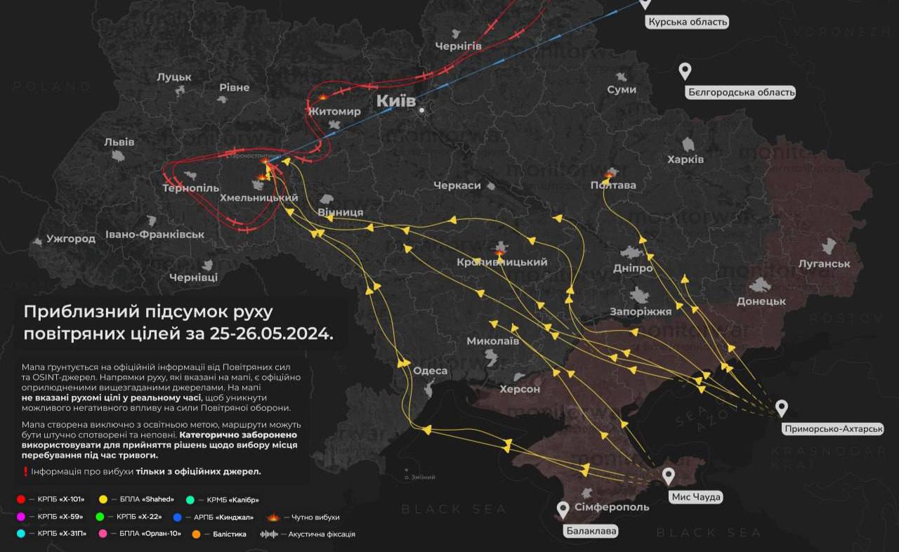 Также взрывы звучали в Хмельницком и Староконстантинове, где находится военный аэродром (в этом населённом пункте пропал свет). Сами же ракеты долетали, судя по карте, и до Тернопольской области.