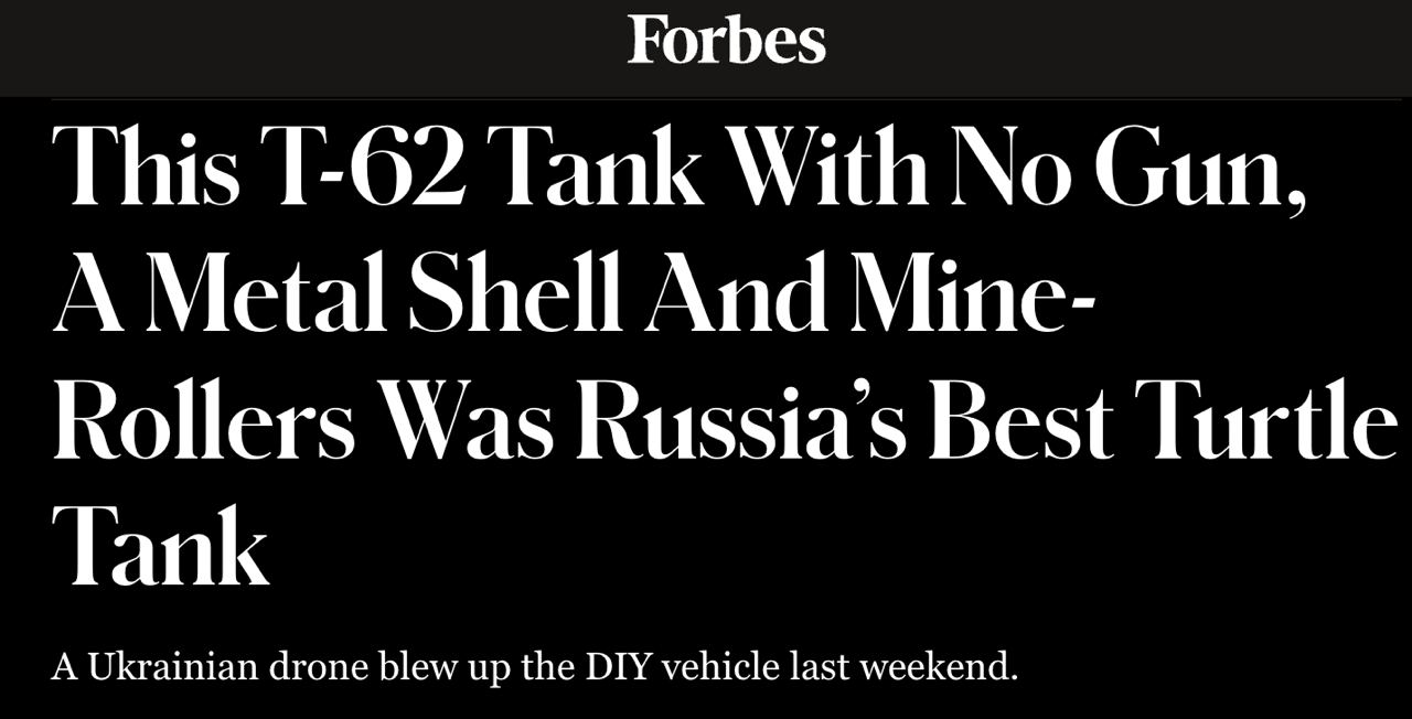 09.20 Forbes рассказывает о российских "танках-черепахах" - обшитых со всех сторон металлом танках Т-62 без пушки.