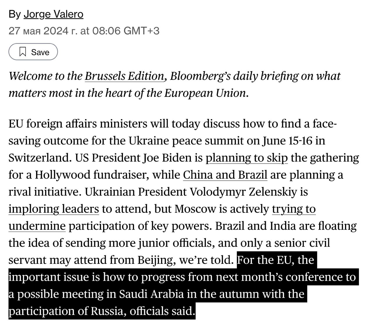 "По словам официальных лиц, для ЕС важным вопросом является то, как перейти от конференции в следующем месяце к возможной встрече в Саудовской Аравии осенью с участием России", - пишет издание.