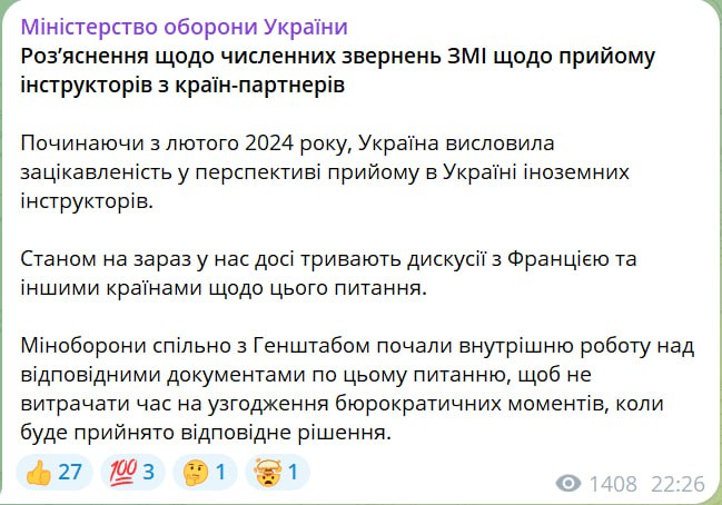22.57 Минобороны Украины подтвердило, что Франция ещё не приняла решения по отправке военных инструкторов в Украину.