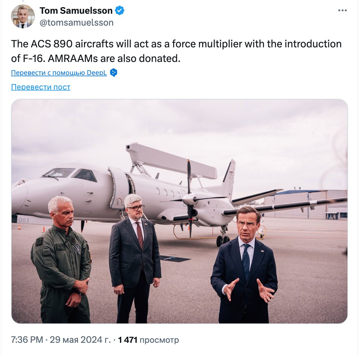 "В пакет входят два самолета воздушного наблюдения и управления (ACS890), которые помогут Украине идентифицировать цели на большом расстоянии", - написал в соцсети Х представитель шведского премьер-министра Том Самуэльссон.