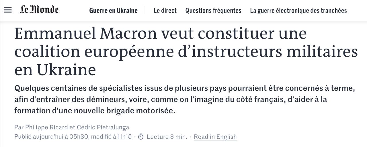 13.30 Макрон хочет сформировать европейскую коалицию военных инструкторов, работающих непосредственно в Украине, пишет Le Monde со ссылкой на источники.