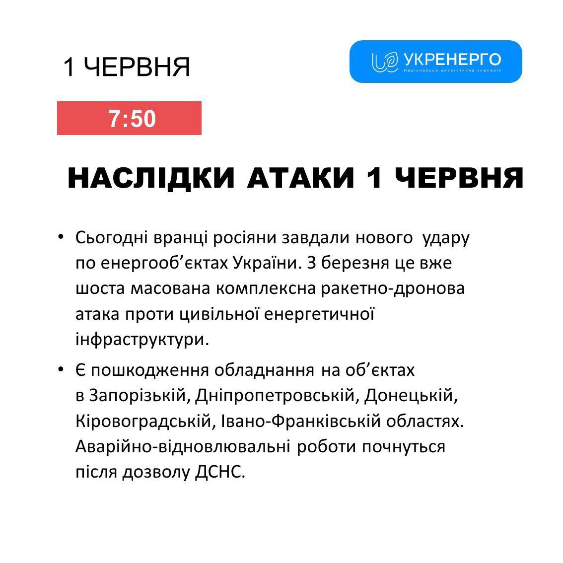 08:00 Сегодня ночью россияне обстреляли украинскую энергетику. Атакованы энергообъекты в Запорожской, Днепропетровской, Донецкой, Кировоградской, Ивано-Франковской областях.