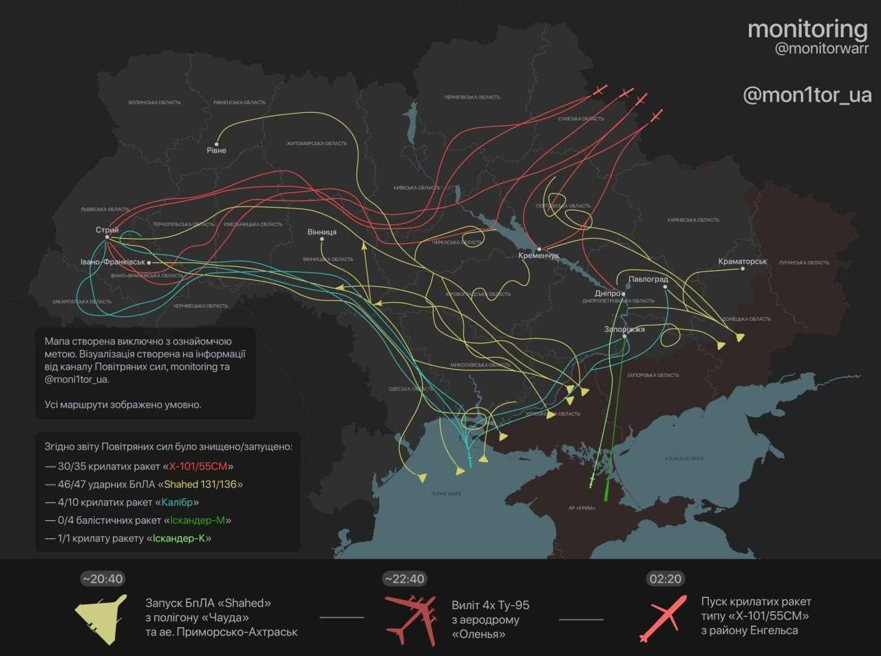 08:59 Примерные маршруты ракет и беспилотников, которые сегодня ночью запускались по Украине.
