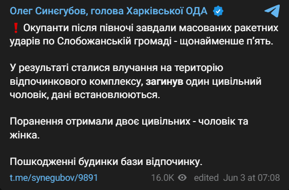 Сегодня ночью российские войска нанесли массированный ракетный удар по Слобожанской громаде - по меньшей мере пять ударов. Погиб мужчина.