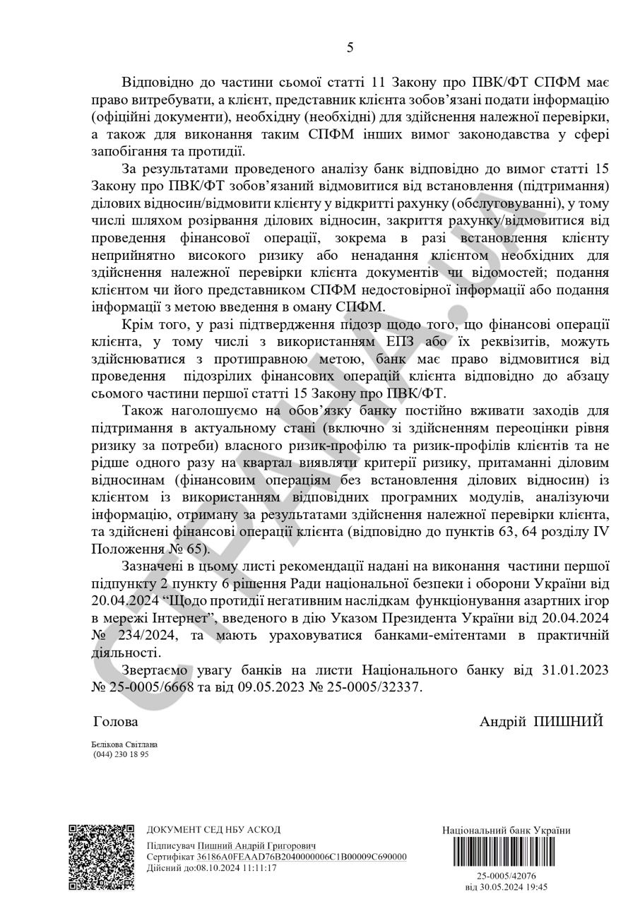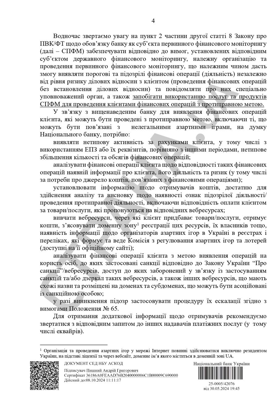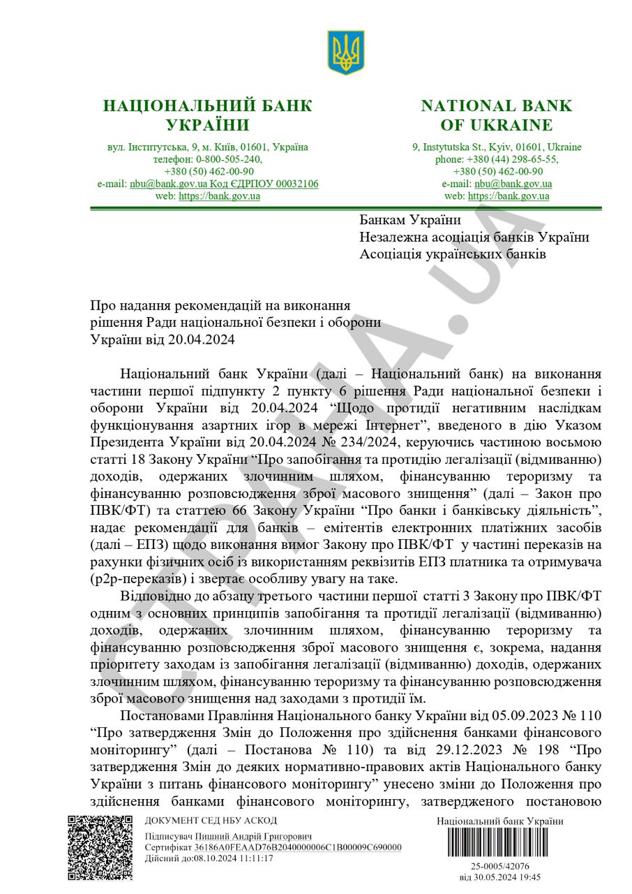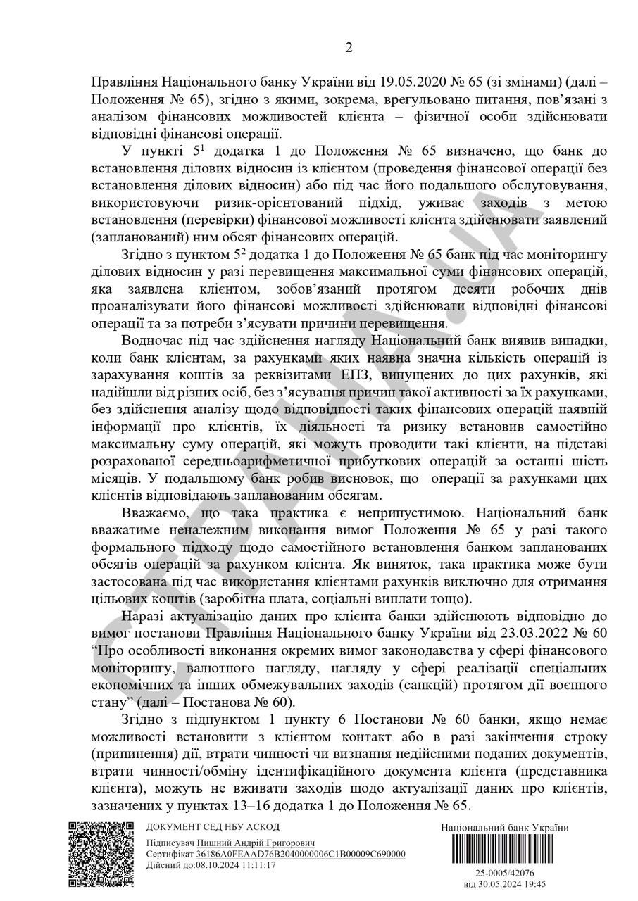 В нем регулятор высказывает свое недовольство тем, что большинство банков делает акцент на анализе общего объема P2P-переводов и меньше вникает в небольшие транзакции, в которых НБУ видит проблемы, особенно когда на карту поступает большое количество небольших переводов от разных лиц.