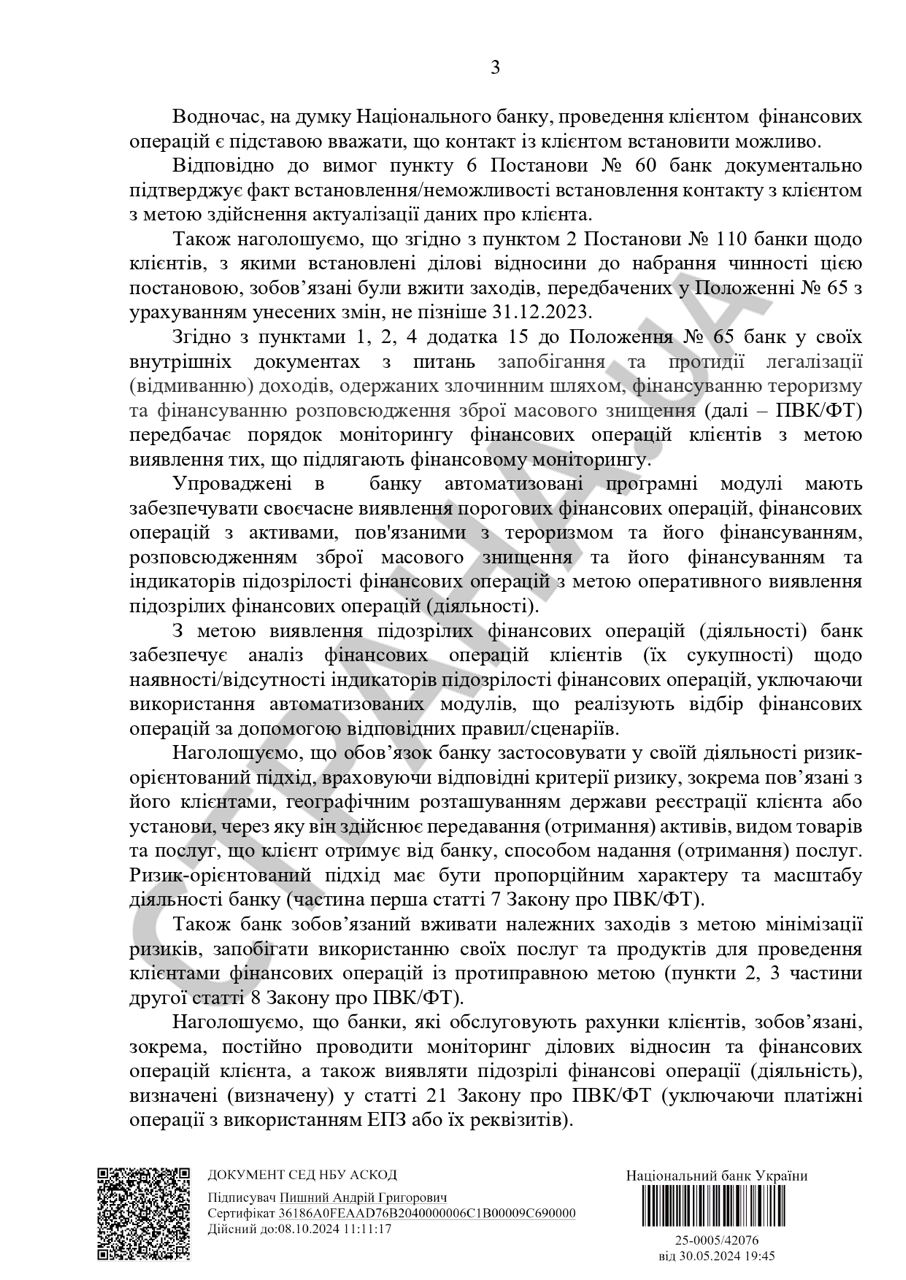 При этом в Нацбанке не хотят слушать отговорок о том, что банк не смог связаться с клиентом и задать ему вопросы, потому что с человеком нет связи из-за того, что тот, например, находится за границей. Чиновники считают, что финансисты могут находить людей через свои мобильные приложения.
