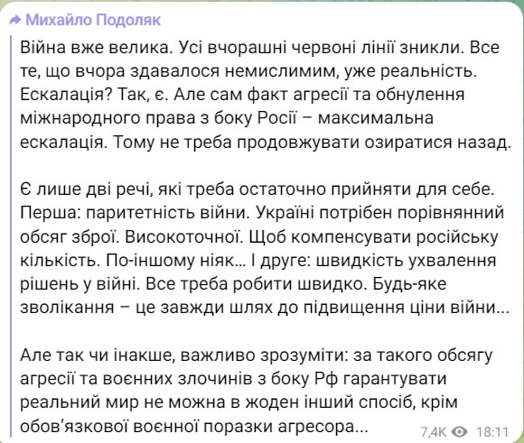 "Первая: паритетность войны. Украине нужен сопоставимый объем оружия. Высокоточного. Чтобы компенсировать российское количество. По-другому никак… И второе: быстрота принятия решений в войне. Все нужно делать быстро. Любое промедление – это всегда путь к повышению цены войны", – считает Подоляк.