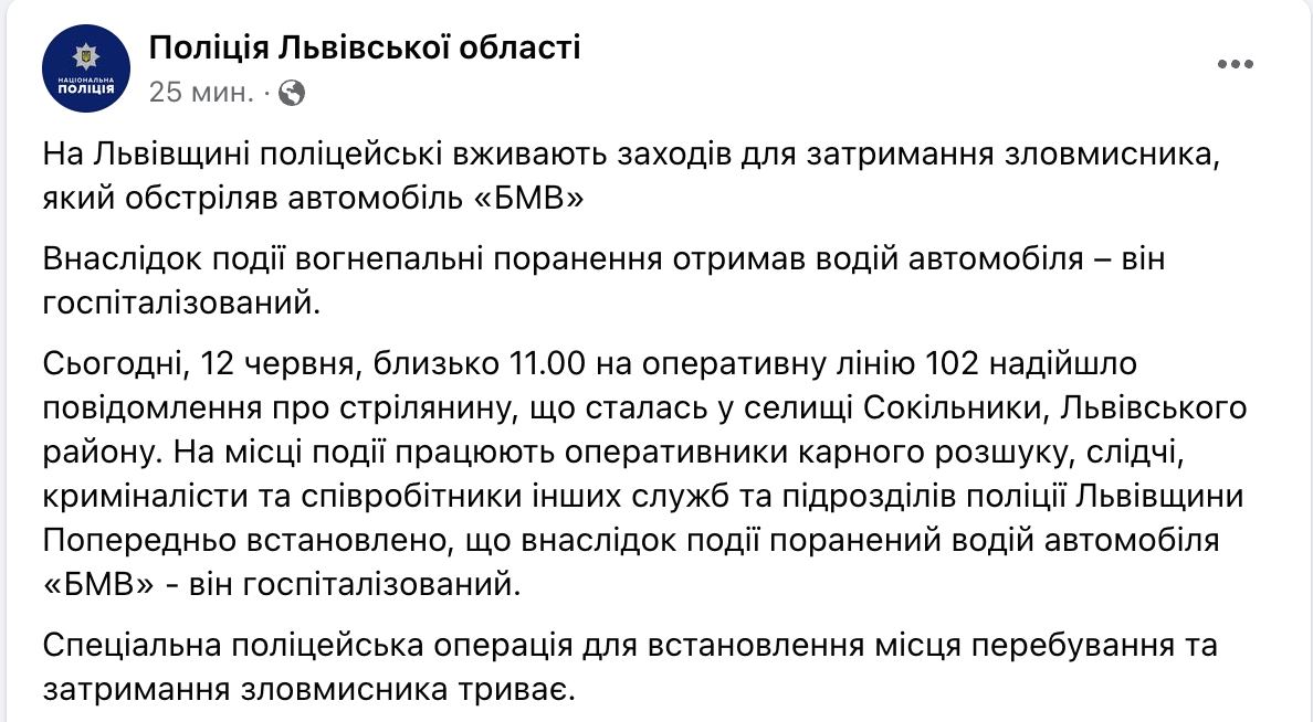 "Сегодня, 12 июня, около 11:00 на оперативную линию 102 поступило сообщение о стрельбе, произошедшей в поселке Сокольники Львовского района. На месте происшествия работают оперативники уголовного розыска, следователи, криминалисты и сотрудники других служб и подразделений полиции Львовщины. Предварительно установлено, что в результате происшествия ранен водитель автомобиля BMW – он госпитализирован. Специальная полицейская операция для установления места нахождения и задержания злоумышленника продолжается", - сказано в публикации.