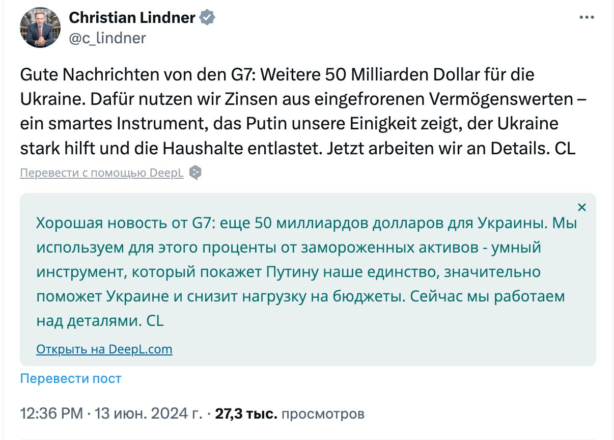 Об этом сообщил министр финансов Германии Кристиан Линднер.