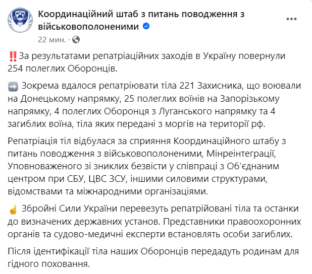 "В частности, удалось репатриировать тела 221 защитника, воевавших на Донецком направлении, 25 павших воинов на Запорожском направлении, 4 павших защитника из Луганского направления и 4 погибших воина, тела которых переданы из моргов на территории РФ", - говорится в сообщении.