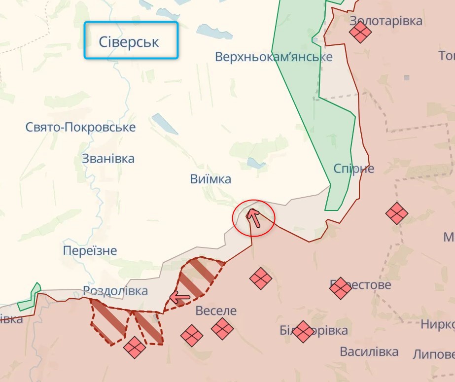 Генштаб в последней сводке, комментируя события на этом направлении, не касается ситуации к югу от Северска. И упоминает, что отражены атаки к востоку от города - в районе Верхнекаменского.