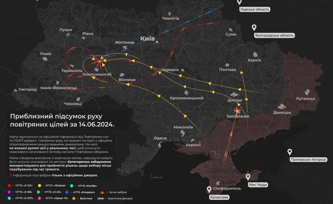 Но, судя по публикуемой в пабликах карте движения воздушных целей, основной целью стала Хмельницкая область. Вероятно - аэродром Староконстантинов, где звучали взрывы. Указано, что по Староконстантинову била и ракета "Кинжал".