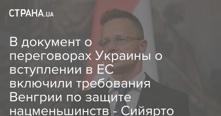 Глава МИД Венгрии Петер Сийярто заявил, что в документ о переговорах с Украиной о вступлении в Евросоюз включили требования Венгрии по защите нацменьшинств.