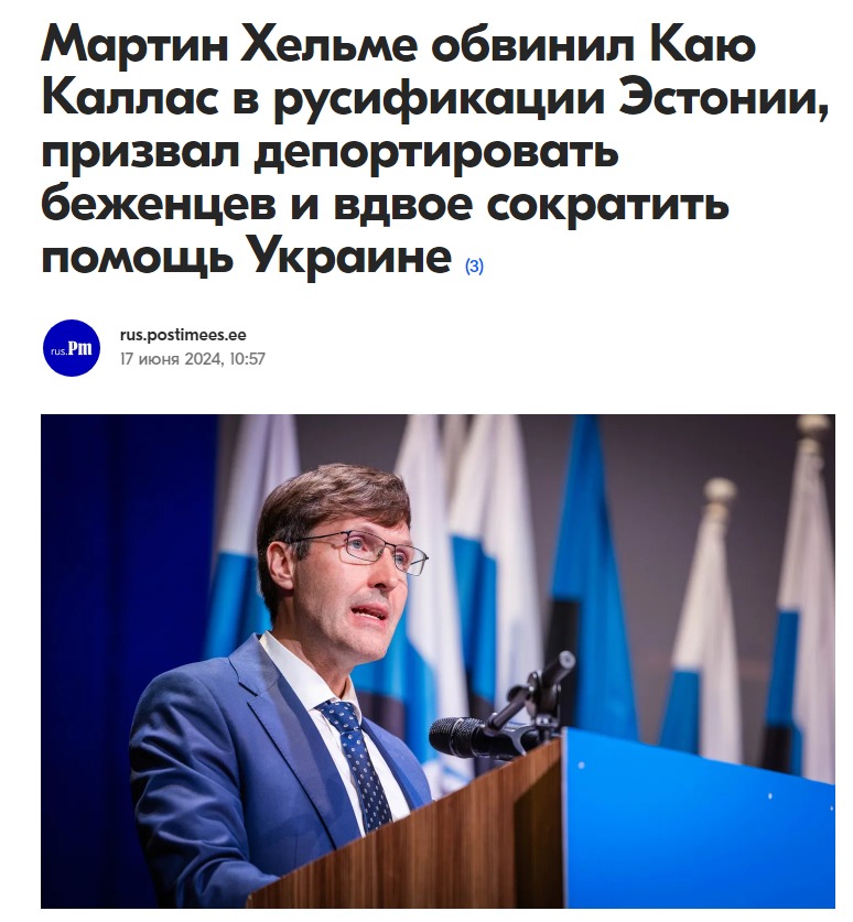 "Они могут называть себя украинцами, и большая часть из них родом из являющейся зоной боевых действий Восточной Украины, но они говорят на русском и очень большая часть из них повторяет нарративы Путина. Факт в том, что правительство Каи Каллас провело за два года большую русификацию, чем это удалось сделать Карлу Вайно, Иосифу Сталину или императору Александру III", - заявил Хельме во время выступления на партийном съезде.
