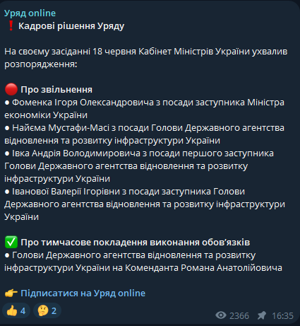 • Андрея Ивко с должности первого заместителя председателя Государственного агентства восстановления и развития инфраструктуры Украины;