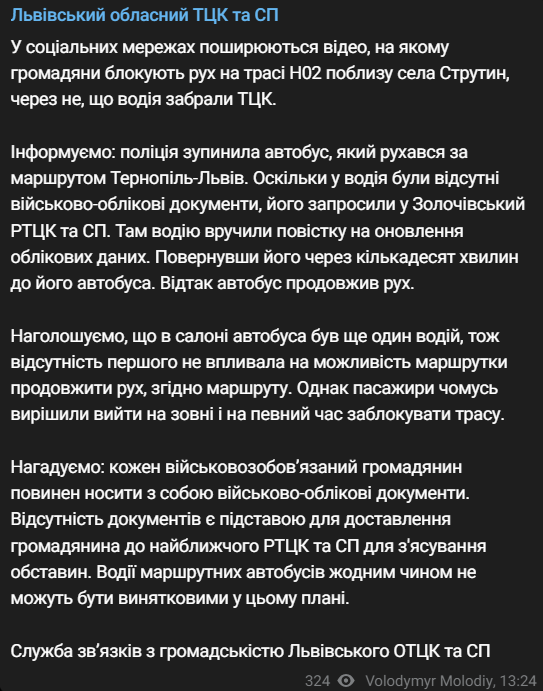 Львовский ТЦК также подтверждает, что люди перекрыли трассу на Тернополь из-за мобилизации водителя автобуса.