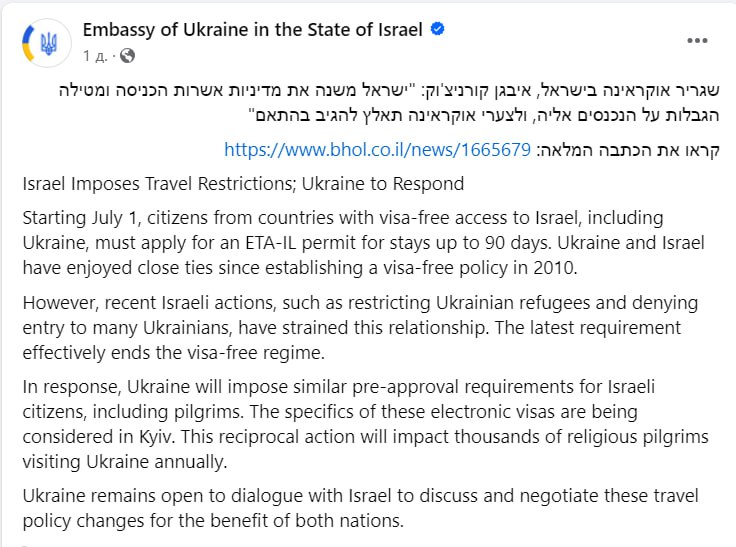 Украина вводит ограничения на въезд граждан Израиля, в частности паломников, в ответ на действия Израиля.