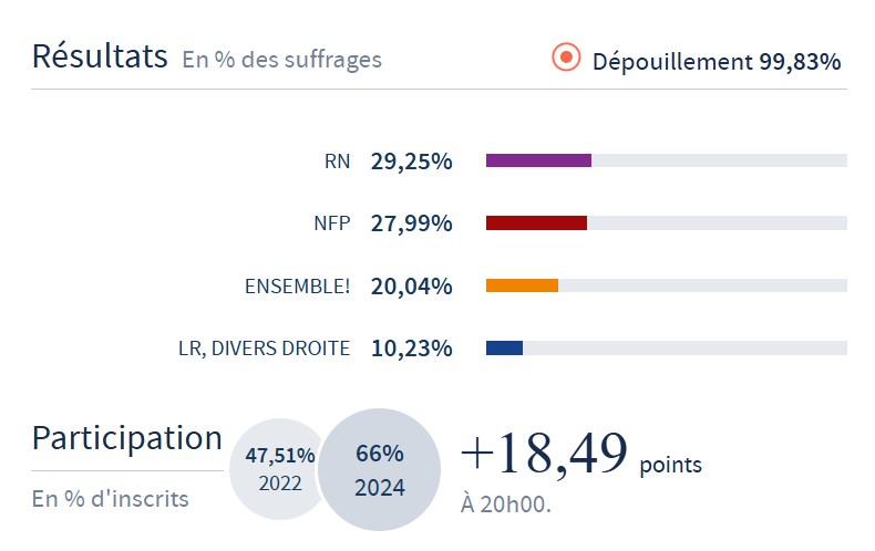 Появились официальные данные по первому туру парламентских выборов во Франции (обработано 99,83% протоколов).