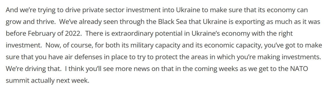 "Мы пытаемся привлечь частные инвестиции в Украину, чтобы убедиться, что ее экономика может расти и процветать. Мы уже видели по Черному морю, что Украина экспортирует столько же, сколько и до февраля 2022 года. В экономике Украины есть исключительный потенциал при правильных инвестициях", - сказал он.