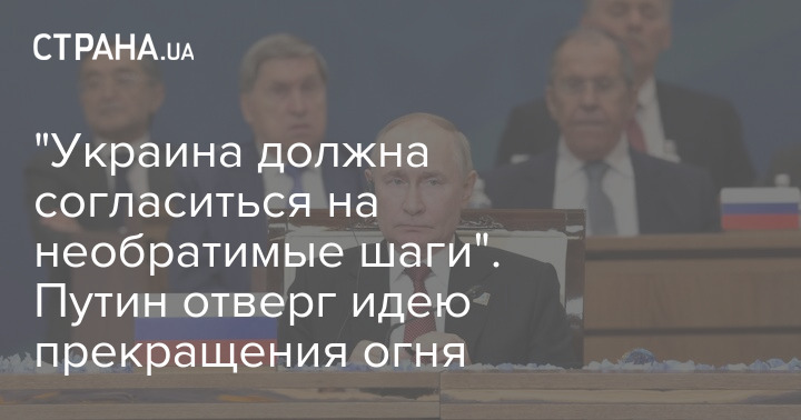 "Россия не может объявить о прекращении огня, так как не уверена в ответных действиях украинской стороны. Прекращение огня без достижения договоренностей по Украине невозможно. Прекращение огня на линии соприкосновения невозможно до начала мирных переговоров с Украиной. Москва не может объявлять о прекращении огня в надежде на позитивные шаги с другой стороны. Украина для прекращения огня должна согласиться на такие шаги, которые были бы необратимыми и приемлемыми для РФ", - заявил Путин.