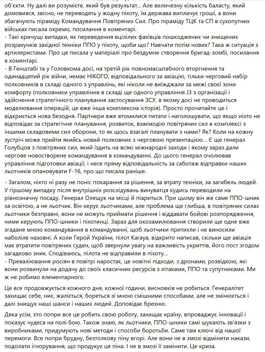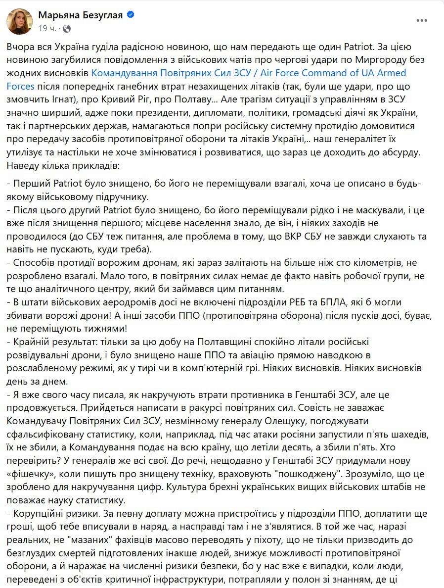 "Совесть не мешает командующему согласовывать сфальсифицированную статистику, когда, например, во время атаки россияне запустили пять "Шахедов", их не сбили, а командование подает на всю страну, что летело десять, а сбили пять. Кто проверит? У генералов все свои", - написала Безуглая.